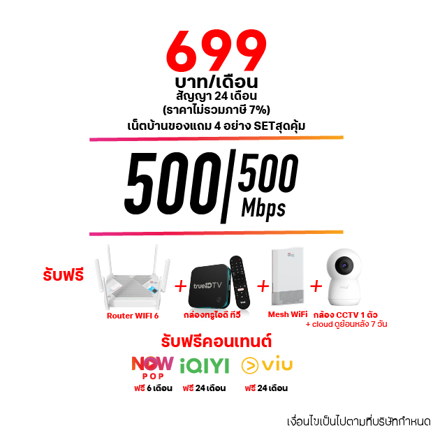 699 บาท/เดือน สัญญา 24 เดือน (ราคาไม่รวมภาษี 7%) เน็ตบ้านของแถม 4 อย่าง SET สุดคุ้ม
