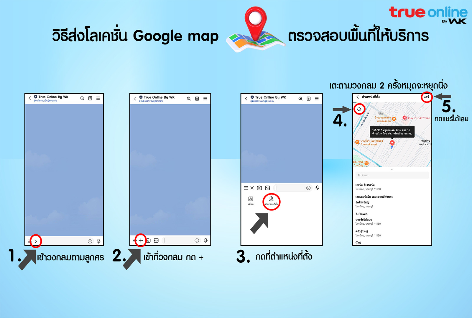 หลังจากปักหมุดเรียบร้อยแล้ว ให้ กด "แชร์" ➡️ เพื่อส่งโลเคชั่นที่คุณปักหมุดไว้ให้กับคู่สาย เพื่อให้เจ้าหน้าที่สามารถตรวจสอบพื้นที่ให้บริการได้อย่างถูกต้องและรวดเร็ว